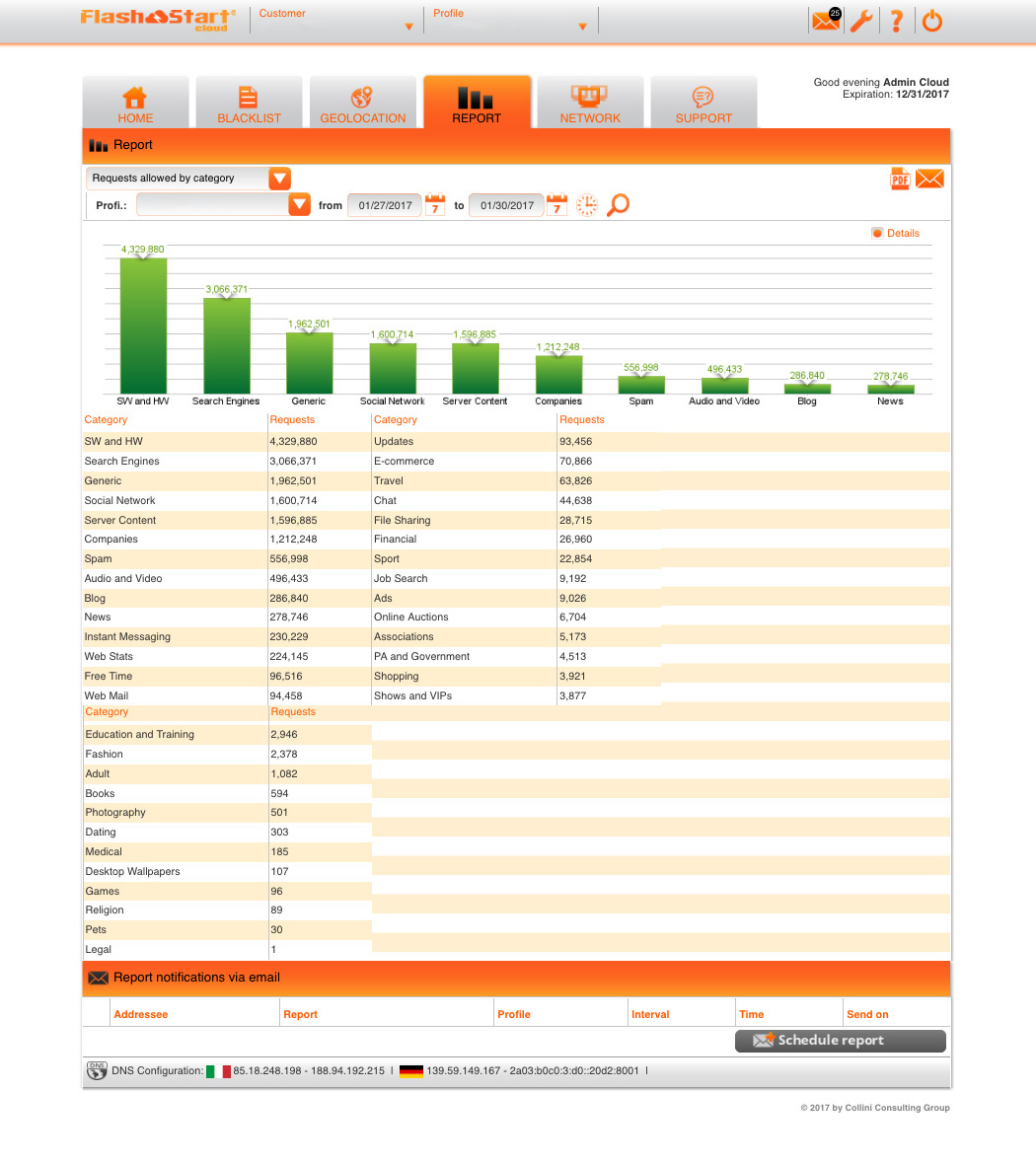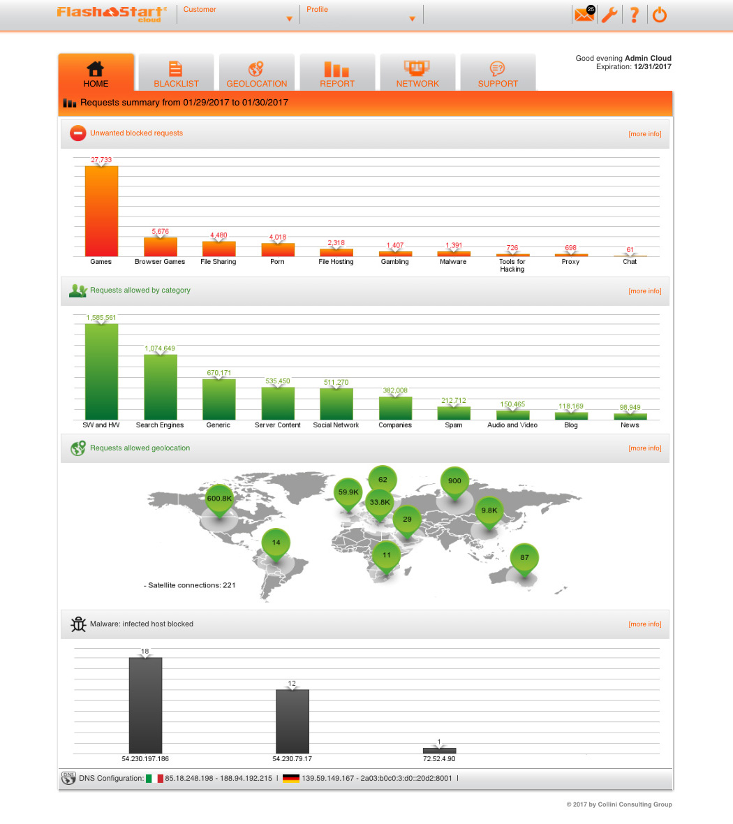 FlashStart identifica automáticamente las categorías de contenido que acceden los usuarios y facilita la definición de reglas de filtrado. Se pueden crear reglas para supervisar o bloquear la actividad y se mantiene un registro de actividades durante 6 meses. Las reglas de filtrado pueden establecerse por hora del día y día de la semana y pueden variar para diferentes comunidades de usuarios. FlashStart también puede bloquear automáticamente los intentos de acceder a sitios de malware conocidos, sitios de ransomware o sitios en cualquier país que se considere asociado con una amenaza específica. El bloqueo involuntario puede resolverse eficientemente (varias alternativas) para apoyar una experiencia de usuario ‘libre de frustración’.